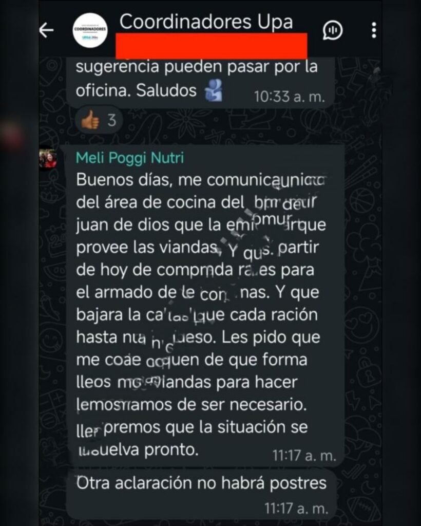 Según un mensaje difundido en un grupo interno de coordinadores, atribuido a la dietista Melina Poggi, se informó que la empresa encargada de proveer las comidas habría decidido suspender la compra de carne para la elaboración de las raciones.