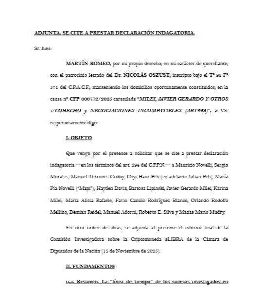 La causa judicial por la criptomoneda $LIBRA sumó un capítulo de alto voltaje político: la querella solicitó que sean llamados a indagatoria el presidente Javier Milei, su hermana y secretaria General de la Presidencia, Karina Milei, el jefe de Gabinete Manuel Adorni y otras 13 personas, en el marco de una investigación por presunto cohecho, negociaciones incompatibles y una posible “asociación ilícita”. El pedido, presentado por el damnificado Martín Romeo junto al abogado Nicolás Oszust, quedó en manos del juez federal Marcelo Martínez De Giorgi y se suma a una solicitud similar impulsada días atrás por el dirigente social Juan Grabois.