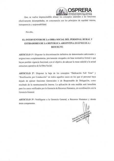 Marcelo Petroni, interventor de la Obra Social del Personal Rural y Estibadores (OSPRERA), desató un conflicto interno tras emitir una resolución que afecta directamente a los trabajadores de la institución. A través de la Decisión N°122, fechada el 26 de mayo, Petroni resolvió eliminar los “adicionales y asignaciones complementarias” que integraban el salario de los 400 empleados de la entidad.