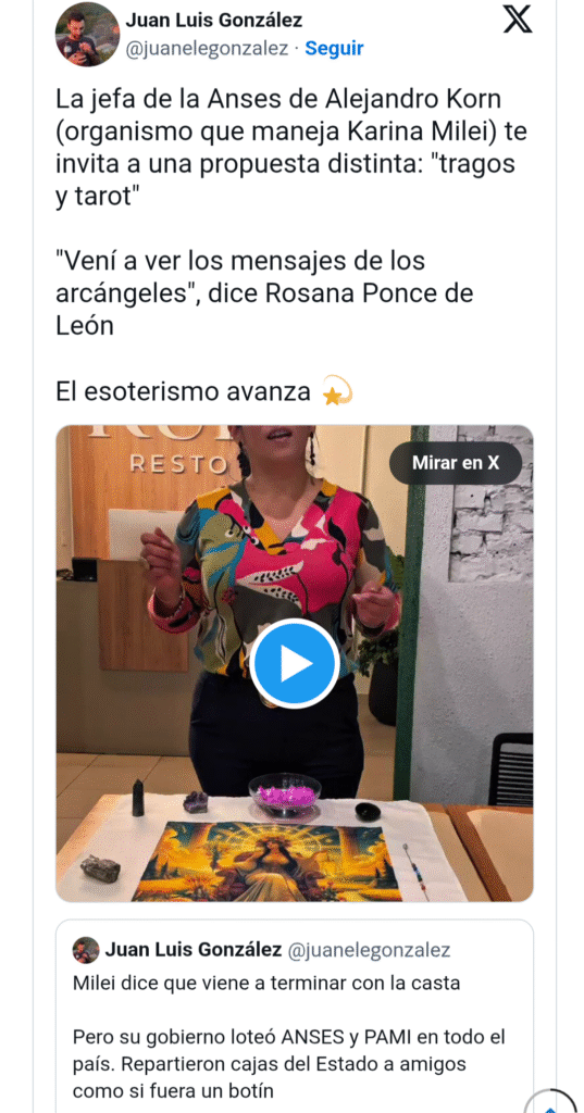 Y si bien cualquiera podría defender el derecho individual de practicar tarot o creer en vibraciones cósmicas, la polémica brota inevitablemente. Porque no es un secreto —ni dentro ni fuera del círculo presidencial— que muchas de las decisiones del gobierno de Javier Milei se toman solo después de que Karina Milei, su hermana y mano derecha, eche mano a las cartas.