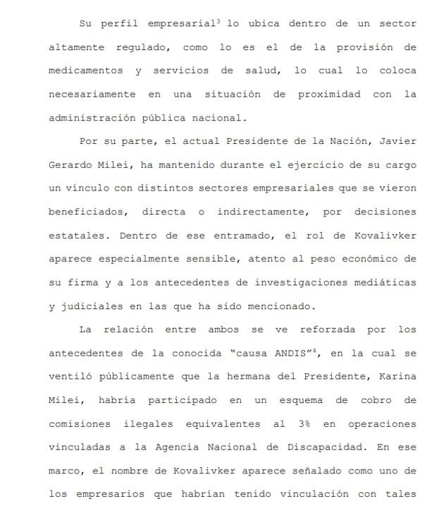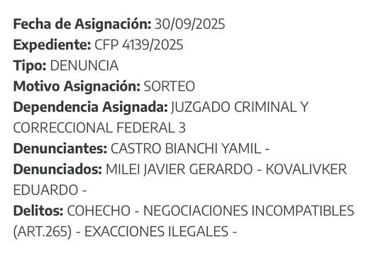 La presentación del abogado Yamil Castro Bianchi recayó en el Juzgado Federal 3, a cargo de Daniel Rafecas. En la denuncia, se centró en la supuesta financiación por parte de Kovalivker del evento político para Milei, lo que consideró que podía tratarse de una maniobra de cohecho, exacciones ilegales y negociaciones incompatibles con la función pública.