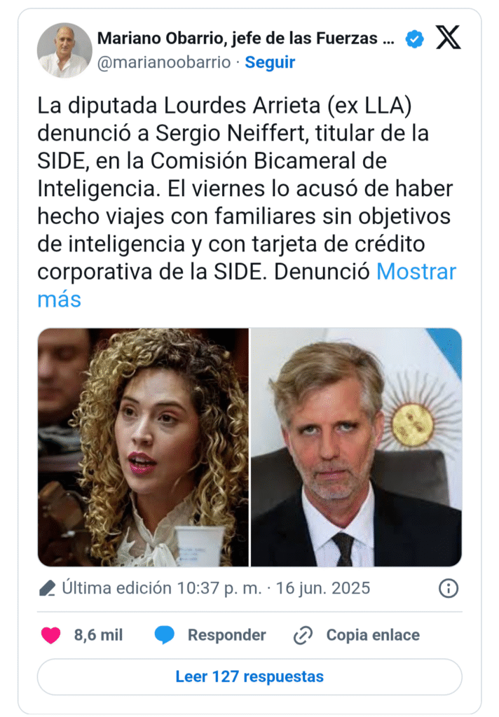 Por primera vez desde que presentó su denuncia formal, la diputada nacional Lourdes Arrieta compareció este martes ante la Comisión Bicameral de Inteligencia para ratificar, punto por punto, su acusación contra el jefe de la SIDE, Sergio Neiffert, su hijo Lautaro, el empresario Leonardo Scatturice y el asesor presidencial Santiago Caputo, a quien señala como el operador clave de una estructura paralela montada desde los márgenes del Estado.