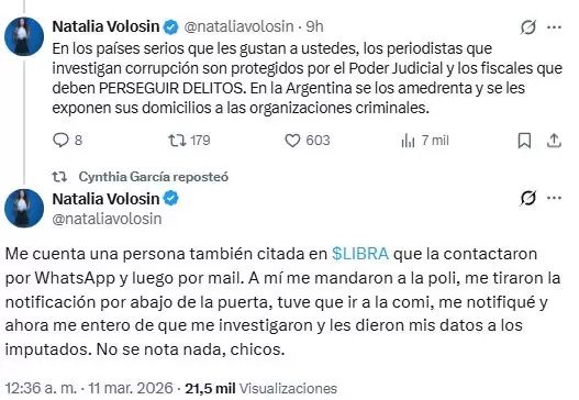Y sumó: “Mi domicilio lo conoce Recursos Humanos de la hononorable institución a la que desprestigiás cada día, TAIANO. COBARDE. Y la policía me notificó en cinco minutos. No hacía falta el NOSIS ni el Renaper. Y mucho menos exponerle mis datos personales a los imputados. En los países serios que les gustan a ustedes, los periodistas que investigan corrupción son protegidos por el Poder Judicial y los fiscales que deben PERSEGUIR DELITOS. En la Argentina se los amedrenta y se les exponen sus domicilios a las organizaciones criminales. Me cuenta una persona también citada en $LIBRA que la contactaron por WhatsApp y luego por mail”.