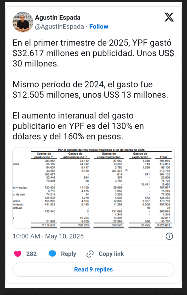 El investigador Agustín Espada analizó los números publicados por la propia compañía y encontró un brutal incremento de los gastos publicitarios en el primer trimestre de este año electoral. “YPF gastó $32.617 millones en publicidad. Unos US$ 30 millones”, afirmó a través de su cuenta de X. Espada agregó que en el “mismo período de 2024, el gasto fue $12.505 millones, unos US$ 13 millones”.