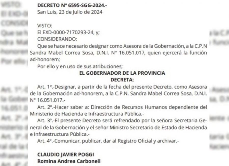 Además, se suma al hecho de que Poggi designó a su pareja, Sandra Mabel Correa Sosa, como “Asesora de la Gobernación” mediante el Decreto Nº 6595-SGG-2024, firmado el 23 de julio de 2024. Esta situación refuerza las críticas sobre el uso indebido de fondos públicos y el evidente nepotismo en la gestión del mandatario.