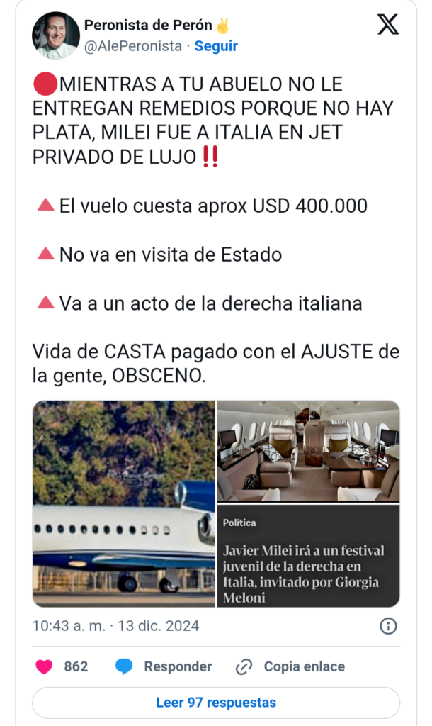 De acuerdo a fuentes oficiales, el promedio de los gastos por viaje presidencial utilizando vuelos comerciales ronda los 177.000 dólares. Mientras promete un ajuste a la población, el mandatario disfruta de un fin de semana de lujo en Italia, entre reuniones sin sentido de alto nivel y agasajos.