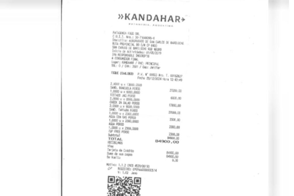 El 28 de diciembre, recién llegado a territorio rionegrino, el funcionario gastó 141.900 pesos para comer una bondiola y otros platos locales en Kandahar, restaurante ubicado en el aeropuerto de Bariloche.