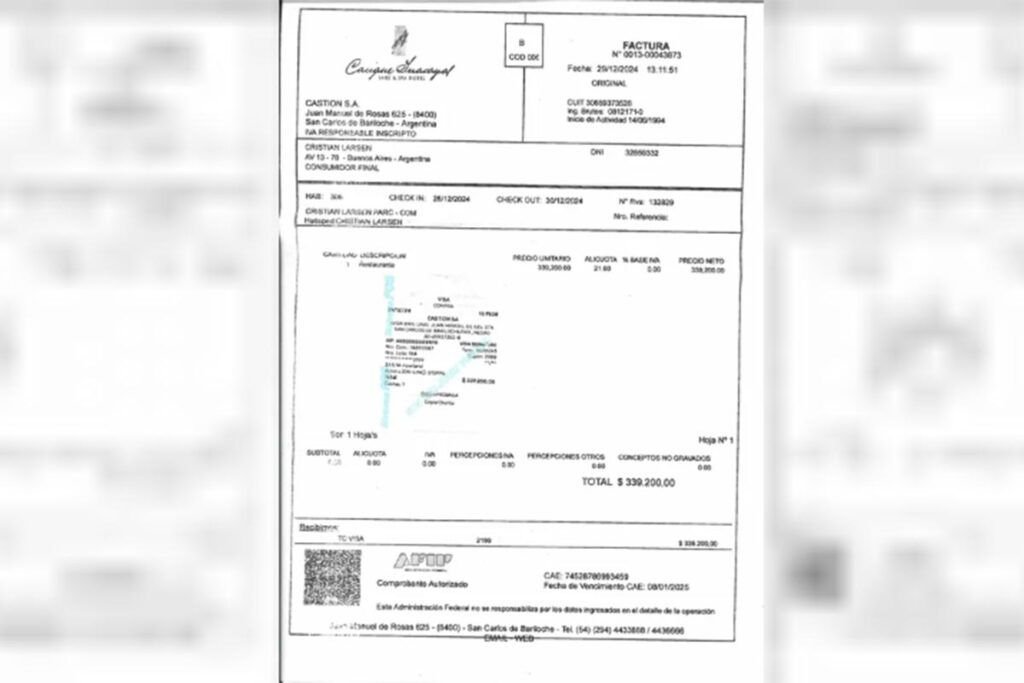 Dentro de las facturas que Larsen presentó para justificar las erogaciones en concepto de viáticos durante las 24 horas que duró su estadía en Río Negro, se constató el consumo por un «almuerzo de trabajo» en el Cacique Inacayal Lake Spa Hotel por 339.200 pesos al día siguiente de su arribo.