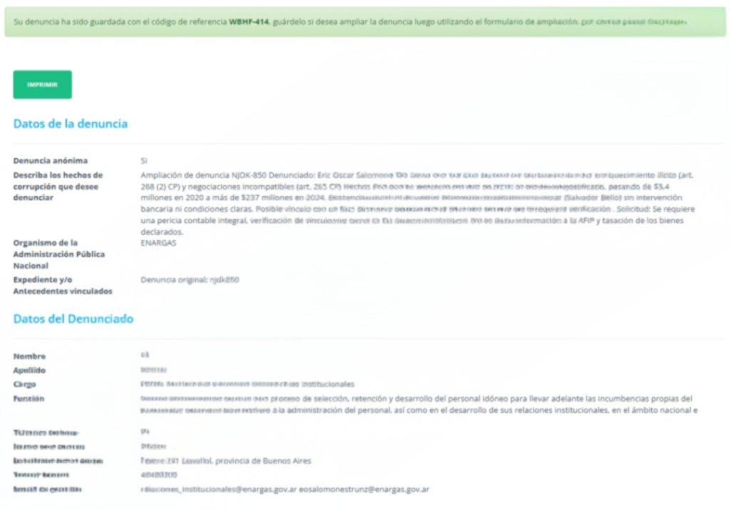 Pero el punto más sensible del nuevo escrito no es solo el crédito en sí, sino la posible relación entre el prestamista y el propio organismo. La ampliación menciona expresamente una “posible vinculación con funcionario del ENARGAS, Fabián Marcelo Bello, a verificar”. Se trata del actual gerente de Desempeño y Economía del ente, designado formalmente en 2021.
