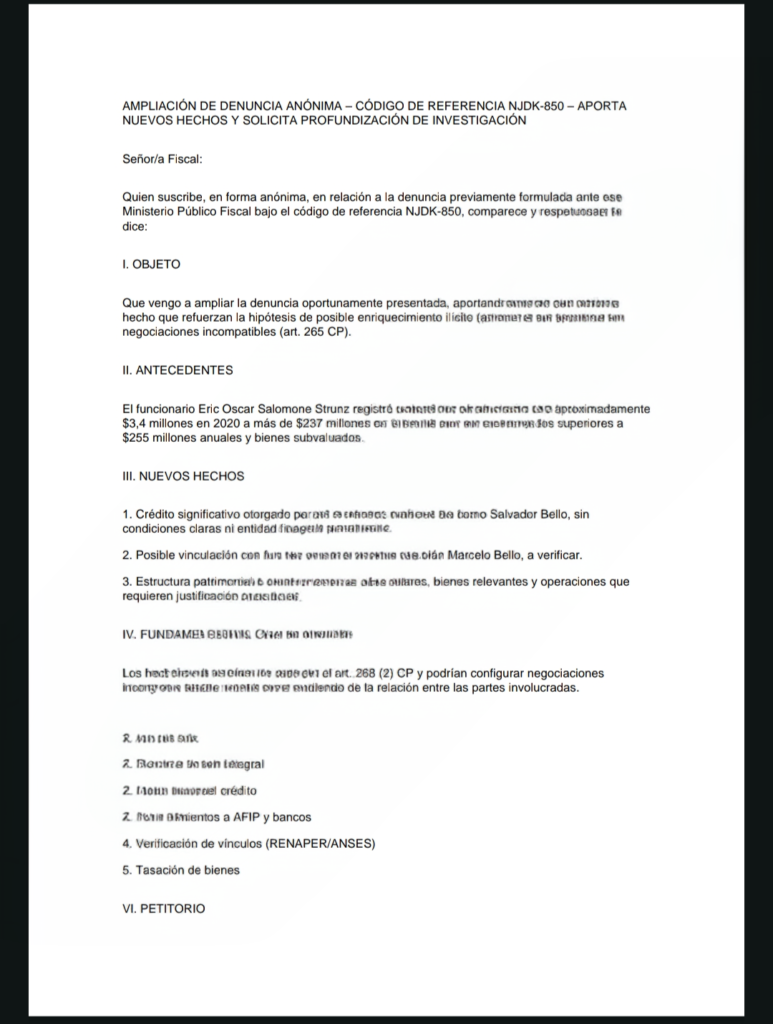 La ampliación de la presentación, registrada bajo el código NJDK-850 ante el ministerio Público Fiscal, introduce “nuevos elementos de hecho que refuerzan la hipótesis de posible enriquecimiento ilícito (artículo 268 inciso 2 del Código Penal) y negociaciones incompatibles (artículo 265)”, según consta en el escrito. En ese marco, el foco ya no se limita únicamente al crecimiento patrimonial del funcionario, sino al posible origen de los fondos que explican ese salto.