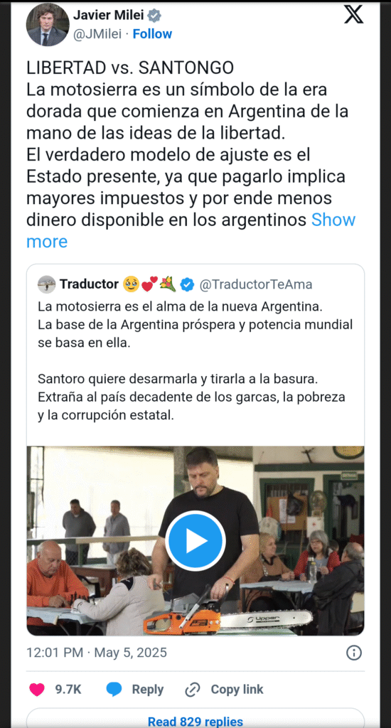 Desde su cuenta en la red social X, el mandatario nacional compartió un mensaje del tuitero libertario “Traductor te ama”, quien había cuestionado el video de Santoro y había escrito: “La motosierra es el alma de la nueva Argentina. La base de la Argentina próspera y potencia mundial se basa en ella. Santoro quiere desarmarla y tirarla a la basura. Extraña al país decadente de los garcas, la pobreza y la corrupción estatal”. Milei no solo citó el mensaje, sino que lo reforzó con munición gruesa contra el dirigente radical-peronista.