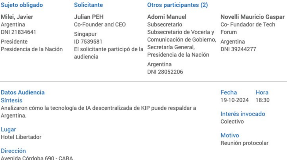 Se trató, de acuerdo a los registros oficiales, de una «reunión protocolar» en la que «analizaron cómo la tecnología de IA descentralizada de KIP (NdR: la empresa de la cual Peh es co fundador y CEO) puede respaldar a Argentina». Como se mencionó, el encuentro fue en el mismo hotel que Milei vivió durante la campaña electoral del 2023 y que fue alquilado para realizar el evento Tech Forum, organizado por Novelli y Manuel Terrones Godoy, donde Milei y Peh hablaron y hasta se tomaron fotos.