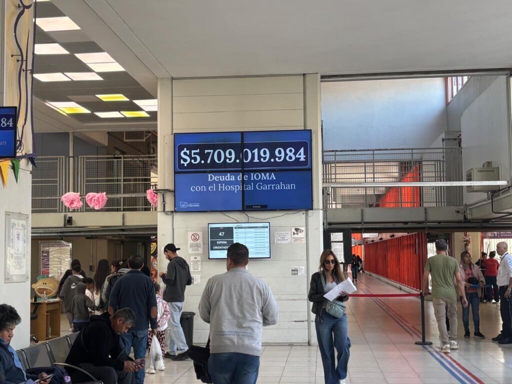 Luego de los reiterados reclamos por parte del Gobierno nacional por la deuda del Instituto Obra Médico Asistencial (IOMA), esta mañana se conoció una imagen en la que se ve una pantalla gigante, dispuesta en una de las salas de espera del Hospital Garrahan, que reflejó la deuda al nosocomio por más de 5 mil millones de pesos.
