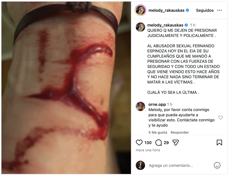 Melody Rakauskas publicó un mensaje de extrema gravedad en sus redes sociales, acompañado por una imagen de su brazo ensangrentado, en el que denunció presiones judiciales y policiales vinculadas a la causa que la tiene como denunciante contra el intendente de La Matanza, Fernando Espinoza.