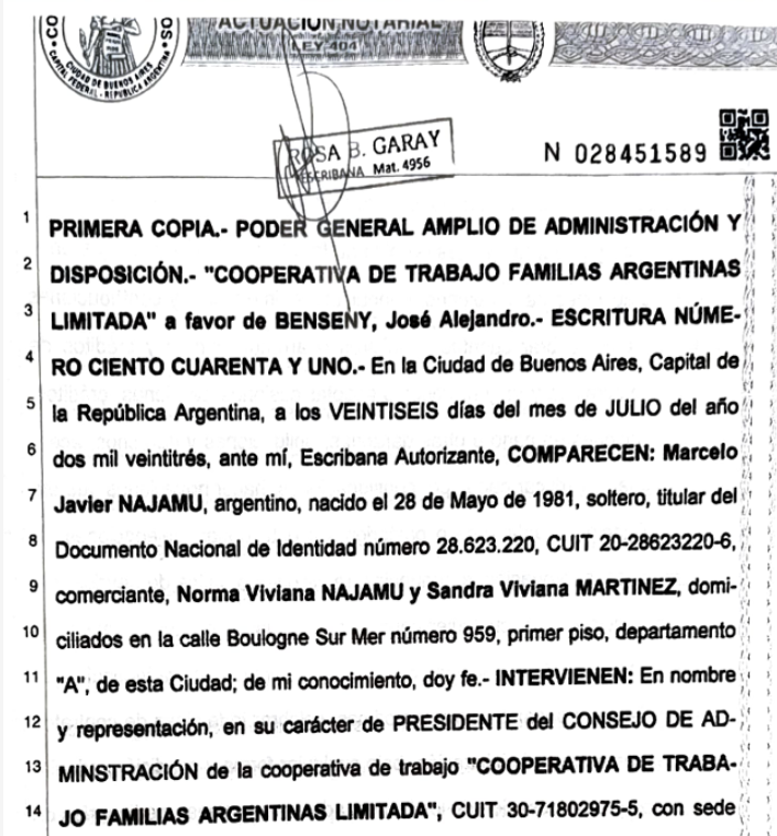 En realidad, según un documento al que pudo acceder Bichos de Campo, el papel de Benseny era mucho más relevante y la cooperativa de trabajo sería solo una fachada para la operación de un grupo empresario. En julio de 2023, en rigor, el presidente del consejo de administración original comerciante llamado Marcelo Javier Najamu, firmó un “poder general amplio de administración y disposición” a favor de José Alejandro Benseny, que a partir de allí obtuvo facultades ilimitadas para manejar a su antojo todo lo que sucedía en dicha entidad de la economía social.
