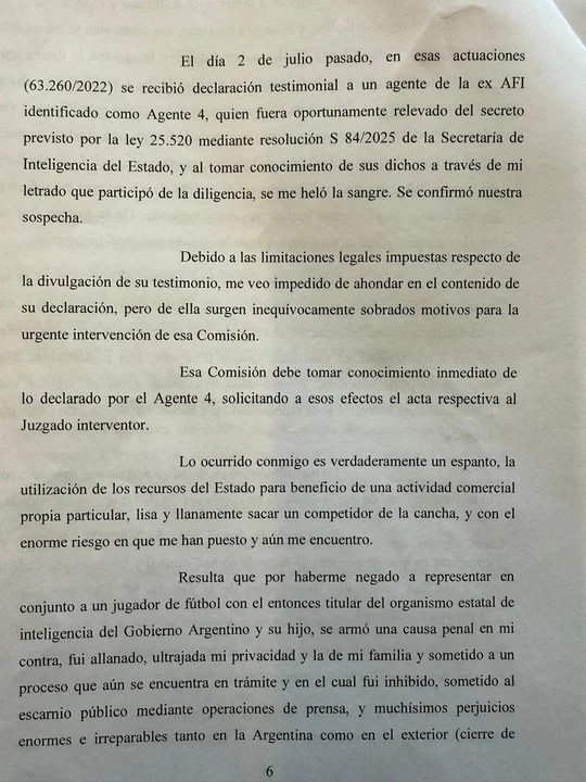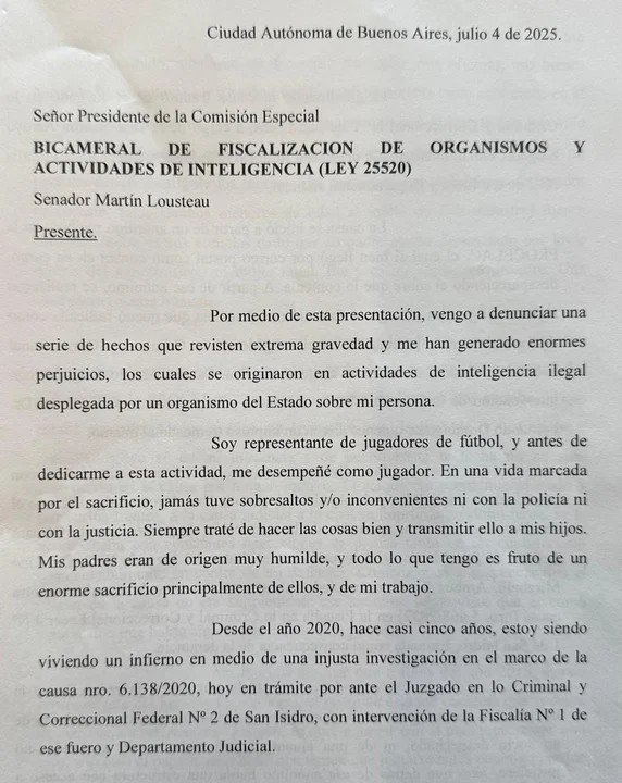 Enclae.agr tuvo acceso a una nota que Uriel le envió al senador nacional Martín Lousteau, en su rol de titular de la Comisión Bicameral de Fiscalización de Organismos de Actividad de Inteligencia, el pasado 5 de julio. “Desde el año 2020, hace casi cinco años, estoy siendo viviendo un infierno en medio de una injusta investigación en el marco de la causa nro. 6.138/2020, hoy en trámite por ante el Juzgado en lo Criminal y Correccional Federal Nº 2 de San Isidro, con intervención de la Fiscalía N deg 1 de ese fuero y Departamento Judicial”, detalla en el texto.