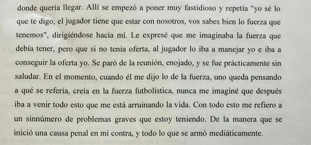 “Quiero decir que, con posterioridad a la reunión, empezó la causa, y curiosamente también perdi al jugador que inmediatamente comenzó a ser representado por Stellar Group, se hizo cargo esa sociedad”, señala Uriel y agrega: “Lo narrado derivó en la radicación de una denuncia por el convencimiento de que la causa en mi contra era sin dudas una causa armada”.