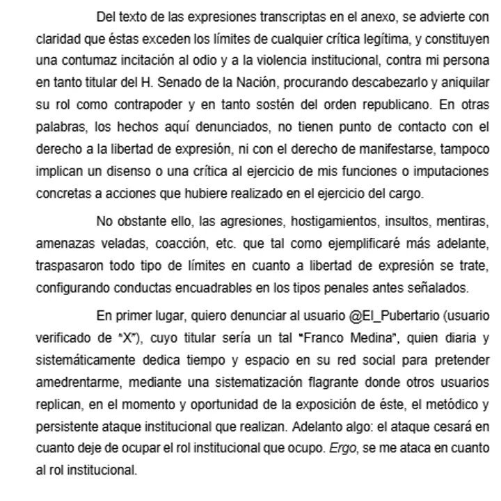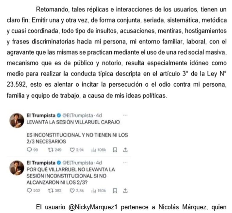 Nicolás Márquez y @ElTrumpista_ también fueron señalados por la vice bajo las mismas acusaciones. “Participan de forma diaria, metódica e insistente en la publicación de insultos, improperios, hostigamiento e incitación al odio de la ciudadanía en general y a los lectores de la red social “X” en particular, contra el poder que presido, la figura de la presidencia del H. Senado de la Nación, mi persona, mi círculo de confianza personal, familiar y laboral“, recalcó.