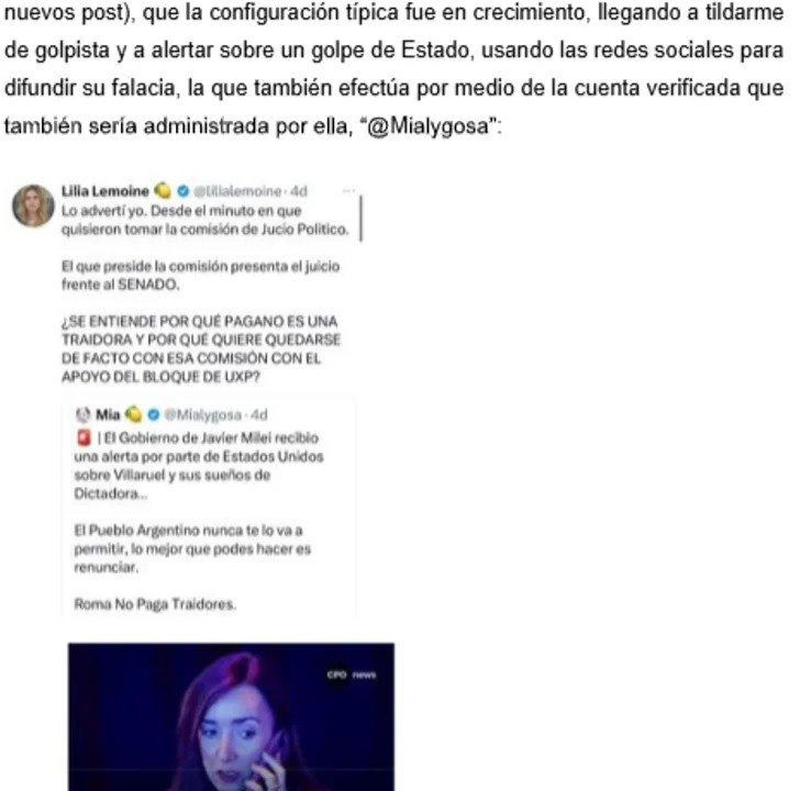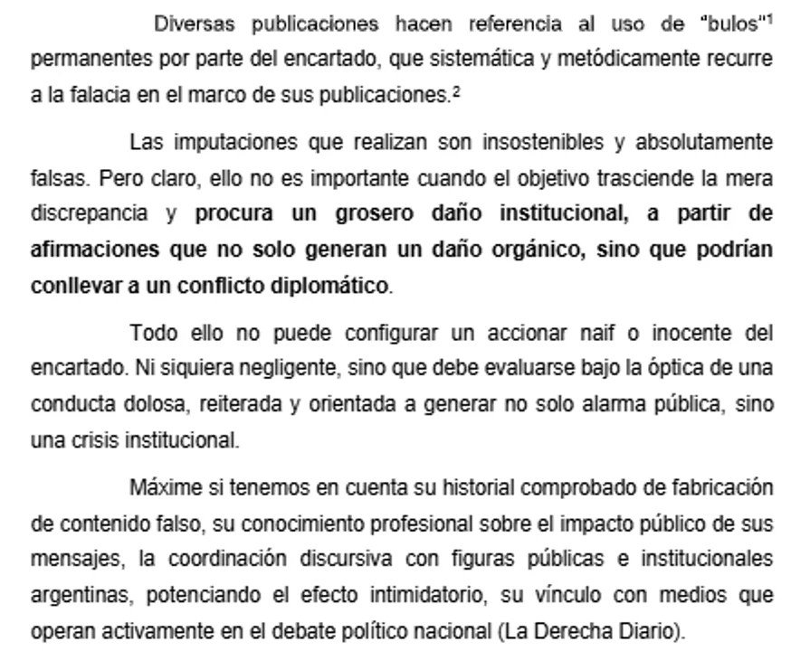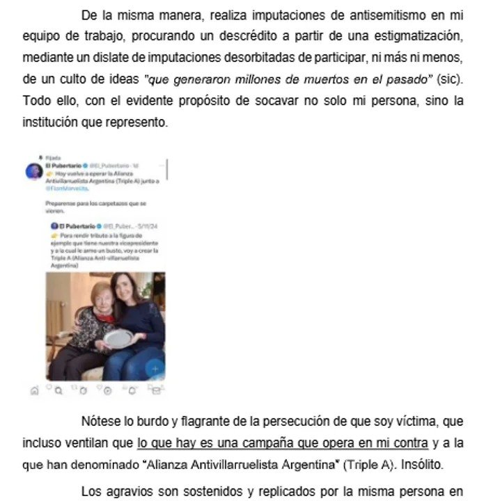 “Las agresiones, hostigamientos, insultos, mentiras, amenazas veladas, coacción, etc. que tal como ejemplificaré más adelante, traspasaron todo tipo de límites en cuanto a libertad de expresión se trate”, aseguró Villarruel al momento de describir lo que considera que hicieron Lilia Lemoine, Nicolás Márquez, @El_Pubertario, @ElTrumpista_, @Mialygosa y @agachatqtlameto, todos usuarios verificados.
