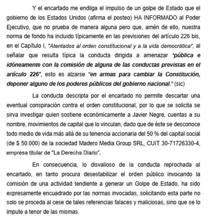 “El Sr. Javier Negre opera contra el Orden Republicano, de manera flagrante, al acusar sin probanza alguna, de los delitos más aberrantes que el sistema democrático pudiera tolerar”, marcó y dijo que el operador libertario la acusó de llevar adelante un golpe de estado.