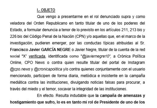 Según la denuncia, Villarruel asegura haber sido “victima de innumerables hechos de hostigamiento hacia mi persona por el desempeño de mis funciones como Vicepresidente de la República Argentina y Presidente del Honorable Senado de la Nación, así como también ha sido victima, en el rol antes referido, de esta embestida mediática a través de las redes sociales, campaña mediante la cual se socaba la división de poderes y la forma republicaba de gobierno y, desde el punto de vista personal, parte de mi familia, funcionarios del Honorable Senado de la Nación y personas allegadas a mi entorno”.