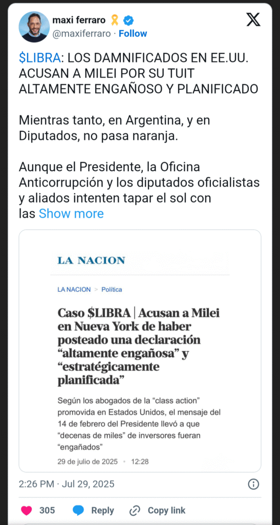 Ferraro agregó que “aunque el Presidente, la Oficina Anticorrupción y los diputados oficialistas y aliados intenten tapar el sol con las manos, para los damnificados estadounidenses es clarísimo: el tuit de Milei fue una declaración promocional altamente engañosa, estratégicamente planificada para darle a $LIBRA una falsa apariencia de legitimidad y afiliación gubernamental en el momento del lanzamiento del token, con el objetivo de engañar a decenas de miles de consumidores”.