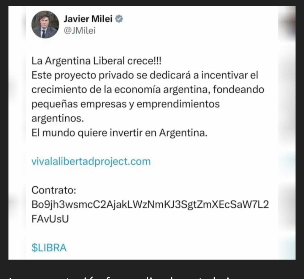 Según los letrados Max Burwick y Margaret Hoppin, ese mensaje fue “estratégicamente planificado para dar a $LIBRA una falsa apariencia de legitimidad y afiliación gubernamental”, lo que habría llevado a que “decenas de miles de consumidores razonables fueran engañados”.