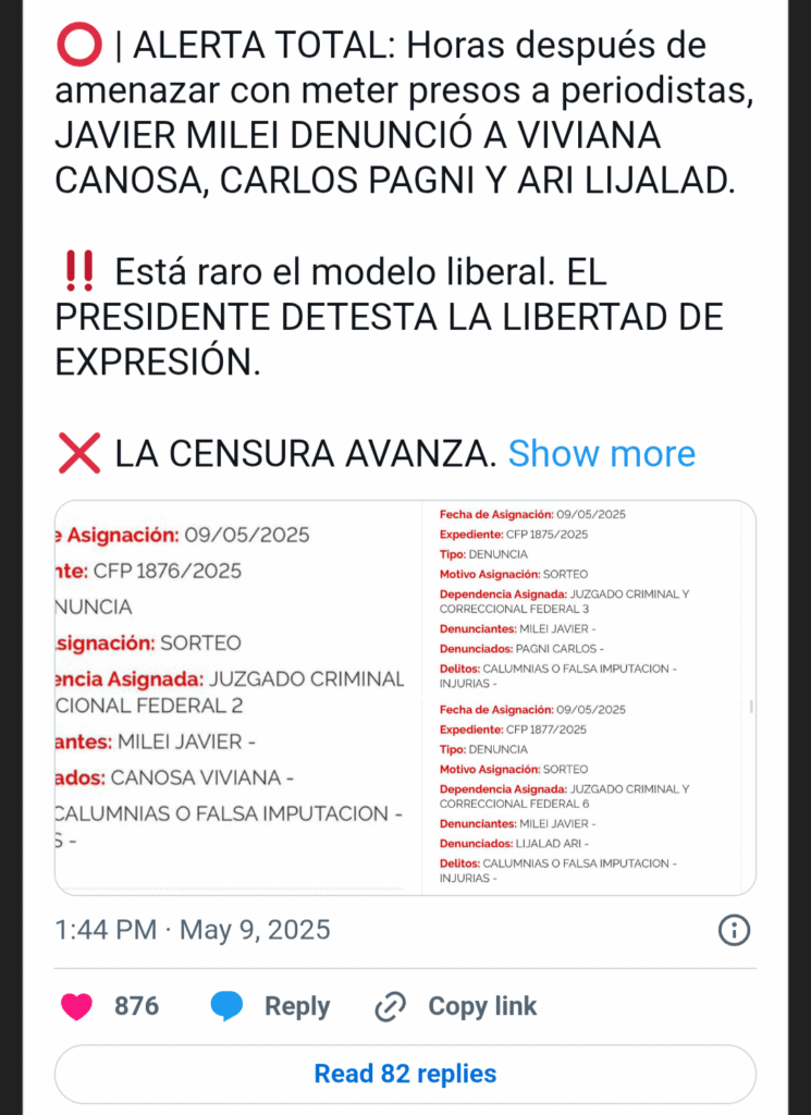 Viviana Canosa, Carlos Pagni y Ari Lijalad son los nuevos objetivos del ataque desenfrenado de la Casa Rosada contra el periodismo. En esta oportunidad, la agresión llegó por vía judicial con denuncias penales por presuntas “calumnias o falsa imputación” e “injurias”. Las acusaciones fueron firmadas por el Presidente de la Nación y ya reposan en los Juzgados Criminal y Correccional Federal N°2, N°3 y N°6 respectivamente, donde la abarrotada Justicia deberá darles tratamiento.