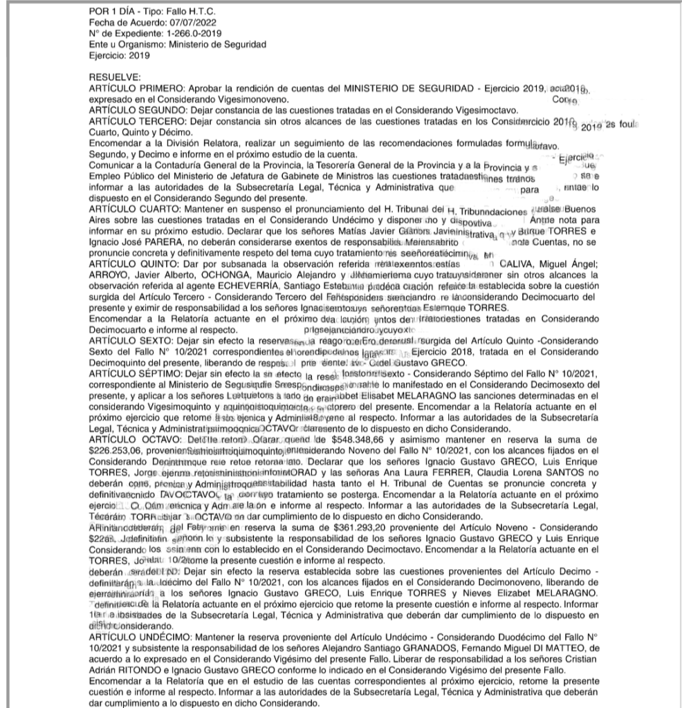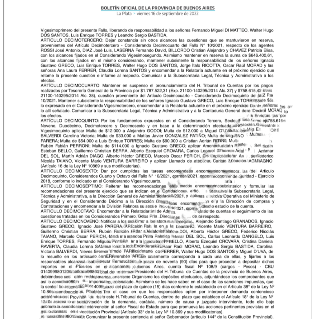 El fallo 413/2022 del Honorable Tribunal de Cuentas de la provincia de Buenos Aires puso de manifiesto irregularidades durante la gestión de Cristian Ritondo como ministro de Seguridad de la exgobernadora María Eugenia Vidal. Las observaciones incluyen montos millonarios, sanciones y responsabilidades atribuidas a múltiples funcionarios, entre ellos, Martín Adrián Diago, cuñado de Ritondo, quien ocupó un rol clave dentro de su cartera.