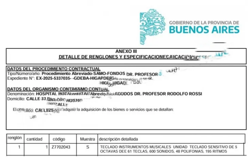 En medio de este panorama devastador, la provincia lanzó la licitación 2025-139-101-268, cuyo objeto es la adquisición de un teclado musical de cinco octavas para el hospital Interzonal de Agudos Rodolfo Rossi. Según el pliego, el instrumento contará con 600 sonidos, 48 polifonías y 195 ritmos, como si la principal preocupación del sistema de salud bonaerense fuera la diversificación musical y no la falta de insumos, la precariedad edilicia o la escasez de personal.