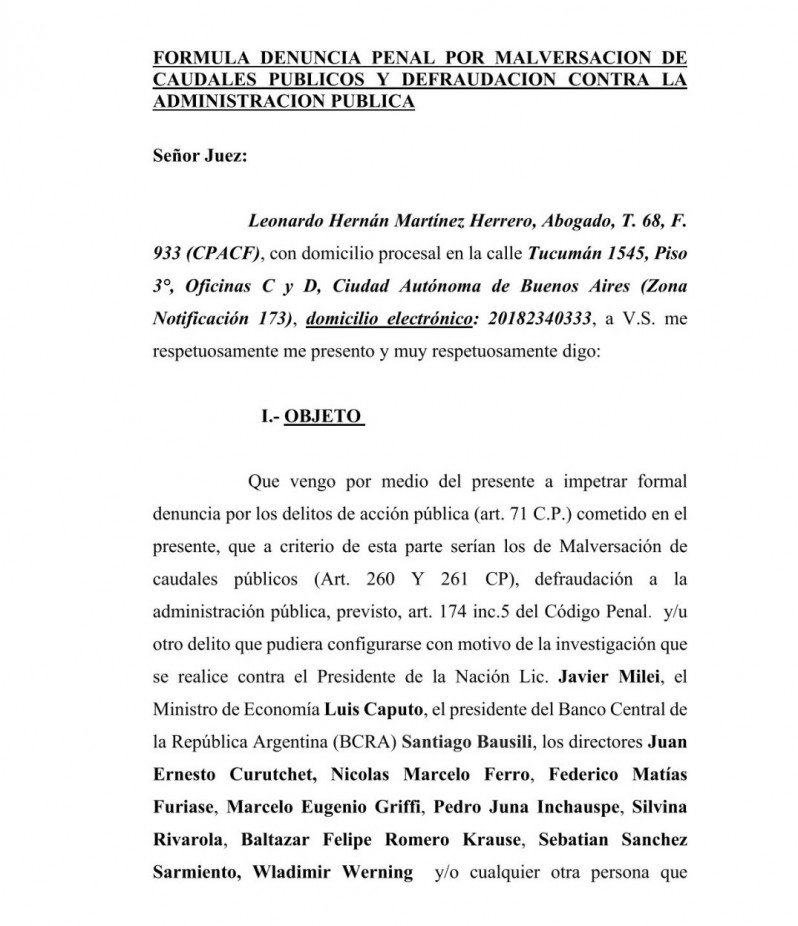 El abogado Leonardo Martínez Herrero presentó una denuncia penal el lunes, antes de que Milei incriminara a su hermana en Neura, contra el presidente, Luis Caputo, Santiago Bausili y todo el directorio del Banco Central. La denuncia es por malversación de caudales públicos y defraudación contra la administración pública.