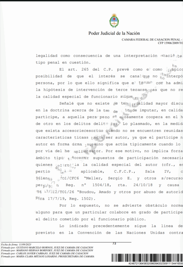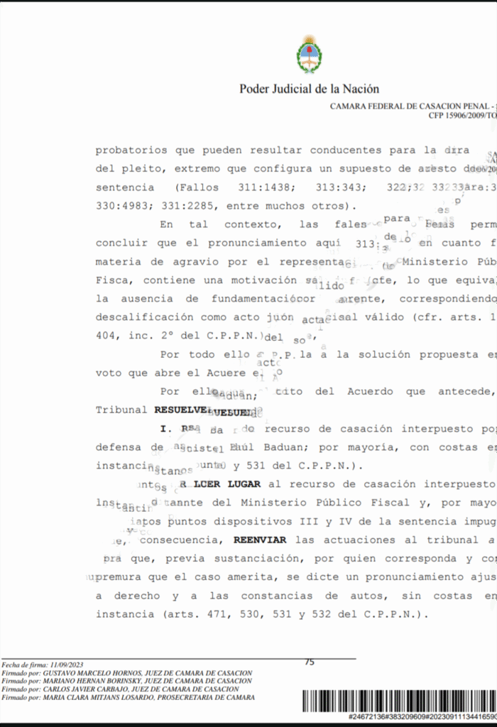 Pese a que la defensa de Baduán alegó falsificación de su firma y motivaciones políticas tras un enfrentamiento con Julio Bárbaro, la Cámara de Casación ratificó la sentencia y solo elevó a la Corte Suprema el recurso extraordinario, que hoy está pendiente de resolución.