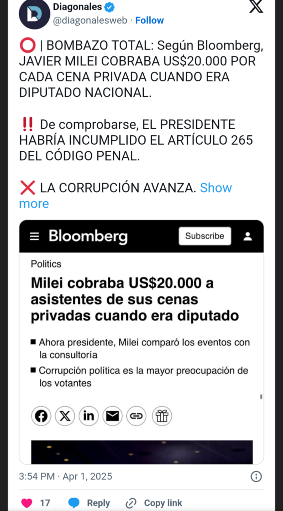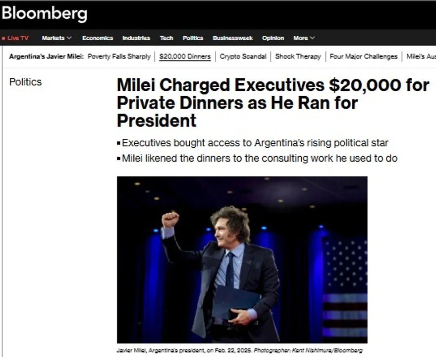 La polémica, que podría generar consecuencias judiciales como lo hizo la estafa cripto que complica internacionalmente al líder libertario, se destapó esta tarde de la mano de un artículo del prestigioso diario estadounidense Bloomberg, que en su sección de política informó que “Milei cobraba US$20.000 a asistentes de sus cenas privadas cuando era diputado” -época en la que se vanagloriaba de donar su sueldo en la Cámara Baja- y advirtió que la “corrupción política” es “la mayor preocupación de los votantes” argentinos.