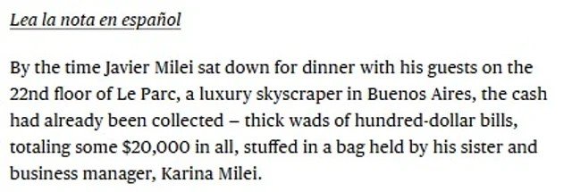 El relato de Bloomberg apunta a una situación profundamente oscura: “Para cuando Javier Milei se sentaba en la cena con sus visitantes en el piso 22 de Le Parc, un rascacielos de lujo en Buenos Aires, el dinero ya había sido recolectado – gruesos fajos de billetes de cien dólares, que sumaban US$20.000 en total, amontonados en un bolso sostenido por su hermana y ‘manager de negocios’ Karina Milei”. La fuerte denuncia despierta graves sospechas sobre la naturaleza de los fondos con los que financió su campaña el actual Presidente.