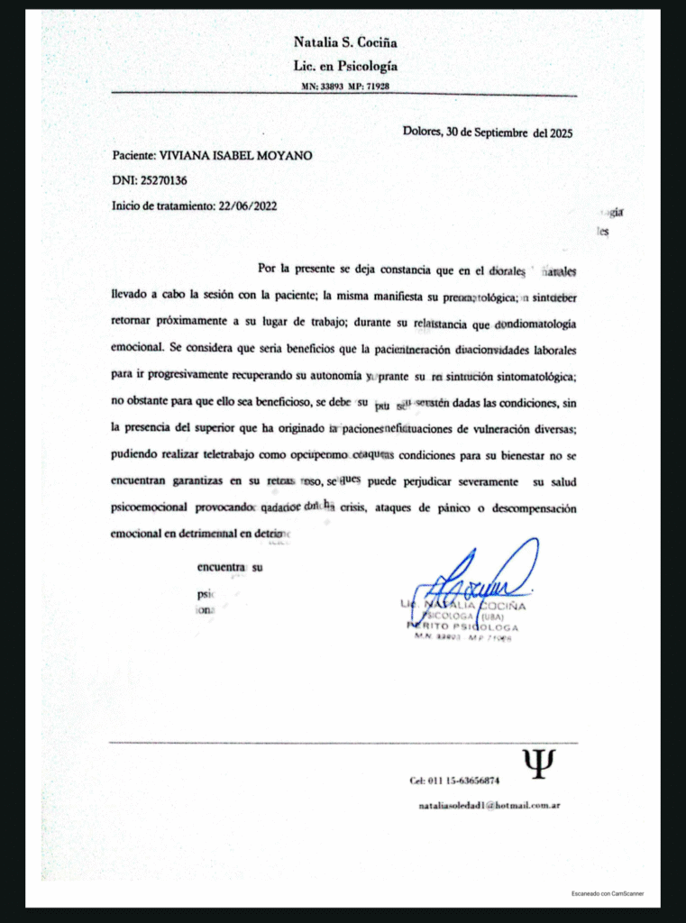 Nos están haciendo la vida imposible. En vez de apartar al director denunciado, nos quieren mover a nosotras. Es violencia institucional”, denunció Viviana Moyano, quien se encuentra bajo tratamiento psicológico por crisis de ansiedad y ataques de pánico derivados de la situación. Su psicóloga, la licenciada Natalia Cociña, advirtió que el regreso de la paciente a su lugar de trabajo sin garantizar condiciones seguras podría “perjudicar severamente su salud psicoemocional”.