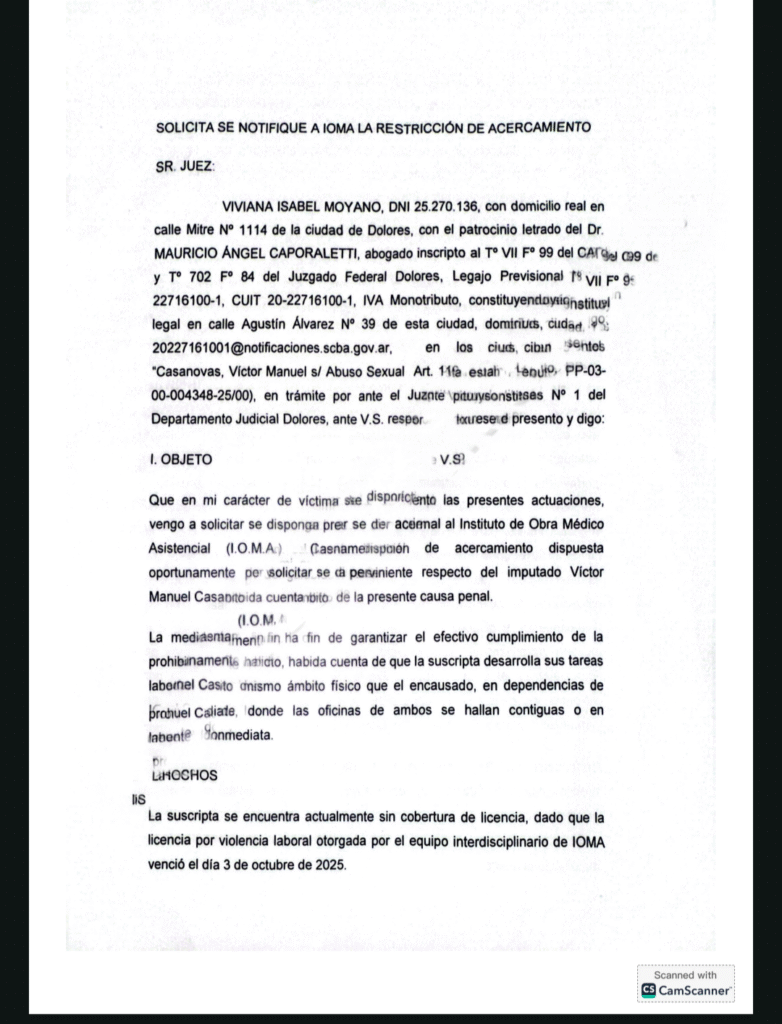 El abogado de Moyano, Mauricio Caporaletti, presentó ante la Justicia un pedido formal para que el IOMA sea notificado de la restricción de acercamiento y obligado a cumplirla, recordando que el propio Protocolo Marco —recién aprobado por el gobierno provincial— impone al empleador el deber de impedir el contacto entre víctima y victimario.