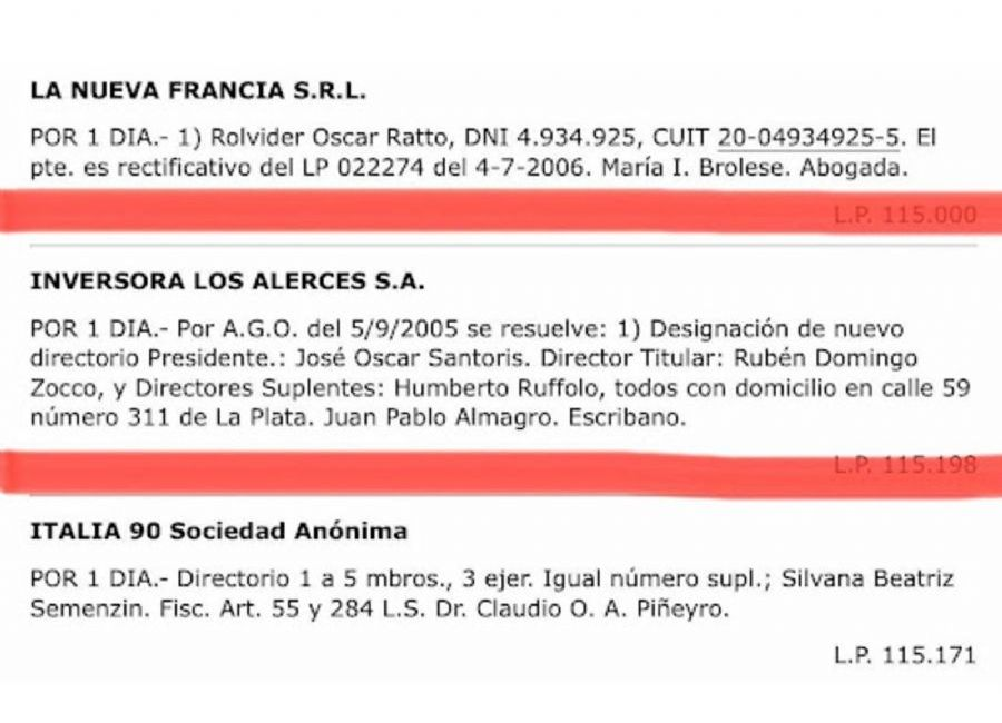 Otra sociedad, Inversora Los Alerces SA, creada con el objetivo de despojar a la Fundación Autódromo Ciudad de La Plata de sus bienes, habría sido maniobrada en complicidad con figuras condenadas por la justicia, como Jorge Ángel Pagano.