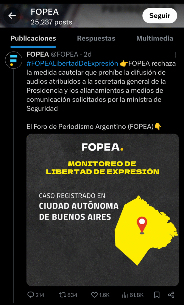 Esta decisión judicial se da en paralelo al pedido de allanamiento del Ministerio de Seguridad en la sede del canal de streaming Carnaval. Según la demanda, «no se trata de una filtración casual, sino de un ataque planificado que apunta directamente al núcleo de la democracia argentina que es el proceso electoral». Se plantea que el objetivo de la difusión de los audios es «generar caos, desinformación y condicionar ilegítimamente las próximas elecciones legislativas», y se menciona a los periodistas Mauro Federico y Jorge Rial. En ese sentido, cualquier allanamiento o medida de estas características puede transformarse en un acto intimidatorio para la libertad de expresión, tal como lo establecen distintos parámetros internacionales.