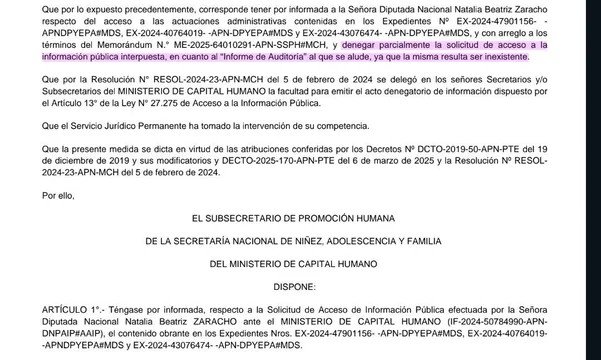 La justificación, pronunciada por Posse en su informe ante el Congreso en mayo pasado y reiterada por numerosos funcionarios libertarios hasta el cansancio, fue utilizada por las autoridades para cortar la ayuda social a los establecimientos. Tras ello, Zaracho interpuso un pedido a la información para conocer los detalles del desconocido relevamiento, pero Capital Humano le negó el acceso a los datos; no obstante, judicialización de por medio, el Gobierno finalmente se vio obligado a responder y confesó la verdad.