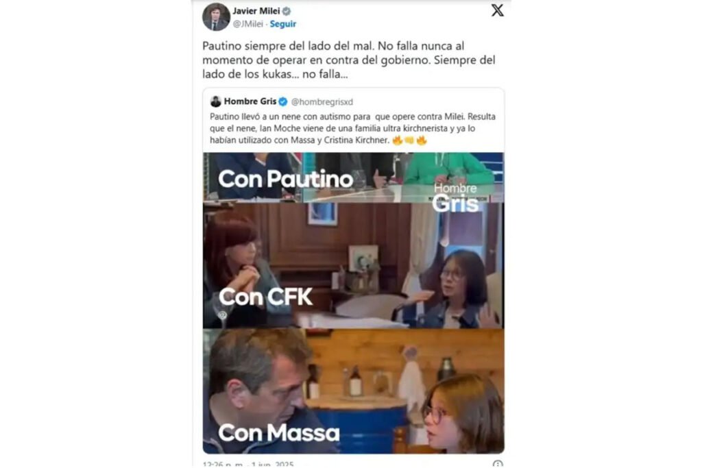 El posteo en cuestión data del 1 de junio, cuando Milei compartió una publicación de la cuenta @hombregrisxd que decía: «Pautino (NdR: por el periodista Paulino Rodrigues) llevó a un nene con autismo para que opere contra Milei. Resulta que el nene, Ian Moche, viene de una familia ultra kirchnerista y ya lo habían utilizado con Massa y Cristina Kirchner».