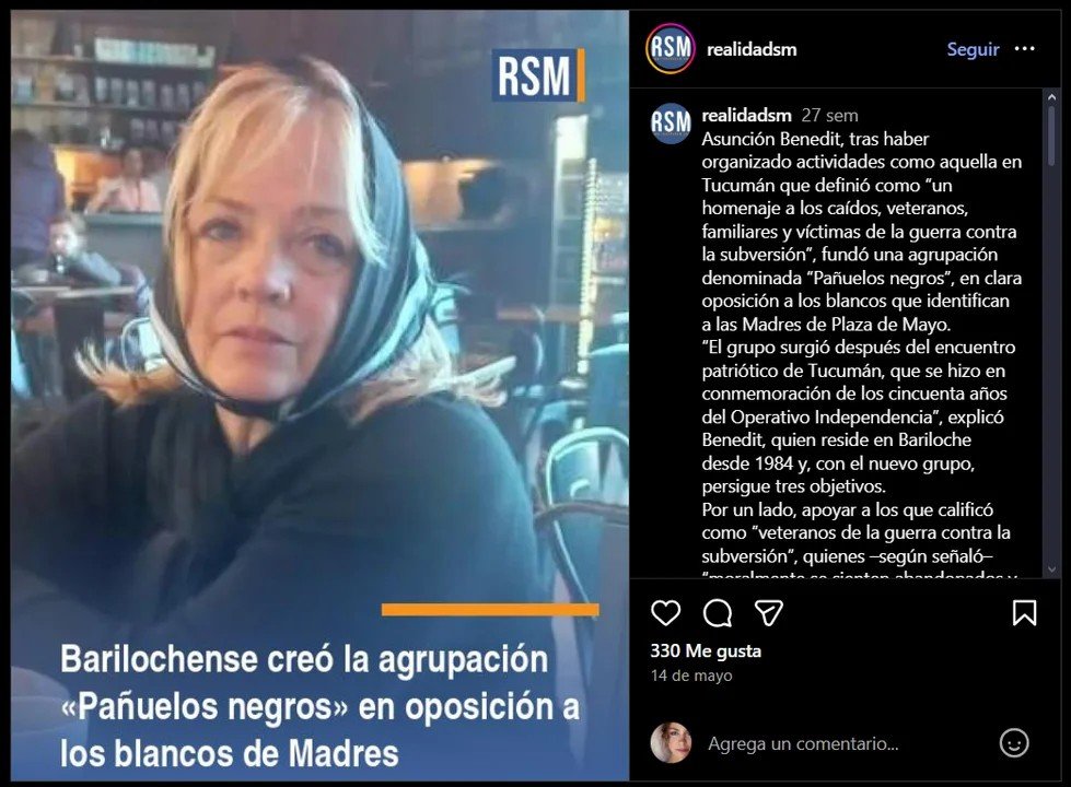Asunción tiene un largo historial militante en Bariloche, ciudad a la que llegó para afincarse cuando a su marido lo destinaron al Regimiento de Montaña. Ya viuda, además de estar en Unión de Promociones y en Pañuelos Negros, fue representante de la fuerza política de Juan José Gómez Centurión, organizó protestas frente a la delegación de Senasa en rechazo a la matanza de aves con gripe para evitar la propagación de la enfermedad aviar; fue parte de cada acto en homenaje a Julio Argentino Roca e incluso fue parte de los manifestantes contra el asentamiento de la los Lafken Winkul Mapu en Villa Mascardi, celebrando las persecuciones, prisión y hasta la muerte de Santiago Maldonado, a quien llamó “maputrucho”.