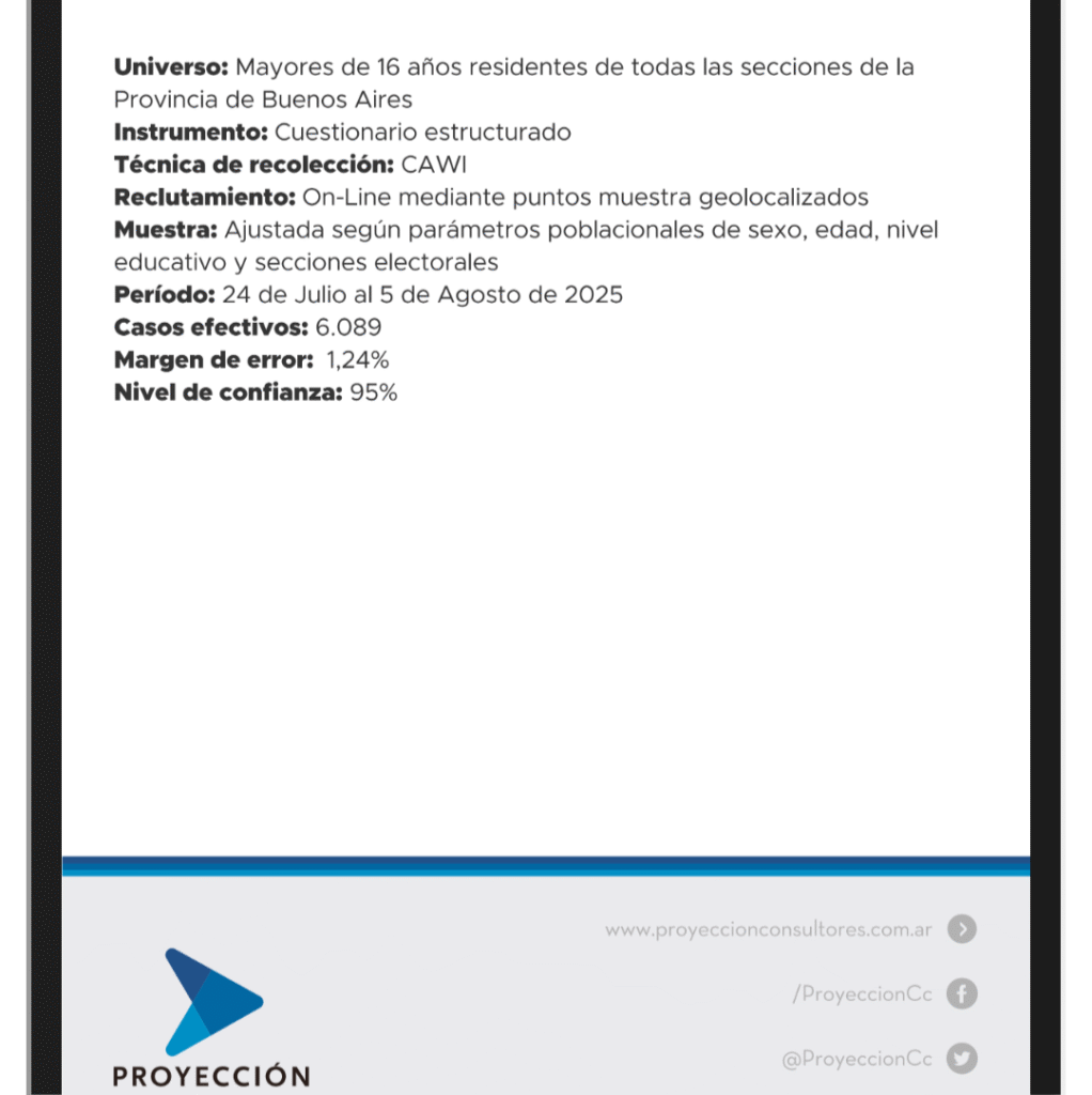 Se trata del panorama electoral bonaerense de Proyección Consultores, que abordó la intención de voto rumbo a los comicios de septiembre que renuevan 46 bancas de diputados y 23 de senadores en la legislatura provincial.