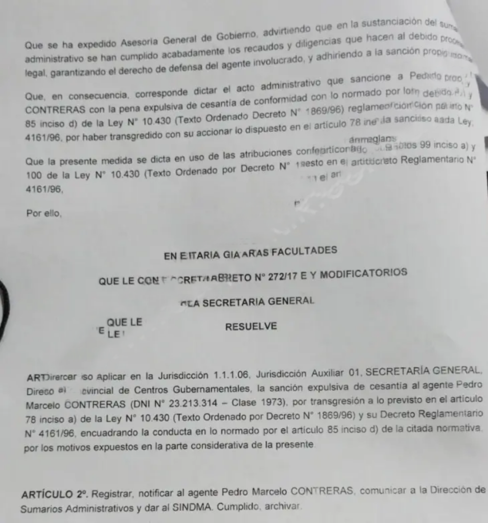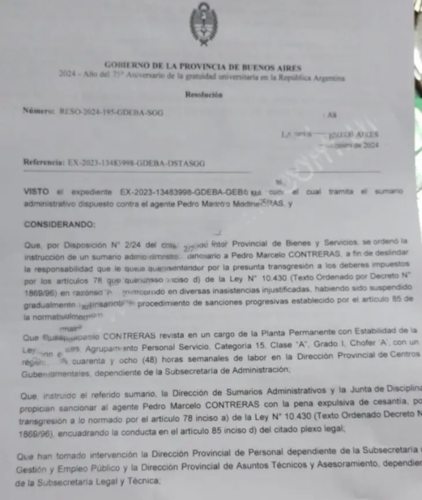 “Desde que llegó esa mujer, fue todo un caos”, denunció la esposa de Contreras. De acuerdo con su relato, su marido presentó problemas de salud que le impidieron asistir a su trabajo en contadas ocasiones, todas ellas respaldadas por documentación médica de hospitales públicos. Sin embargo, la administración provincial argumentó que no se pudo subir la documentación al sistema y le inició un sumario administrativo. A pesar de solicitar una junta médica para validar su estado de salud, el pedido fue ignorado y se procedió a sumariarlo, prohibiéndole manejar un vehículo oficial y, finalmente, despidiéndolo sin derecho a jubilación.