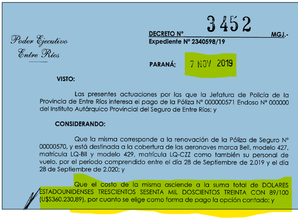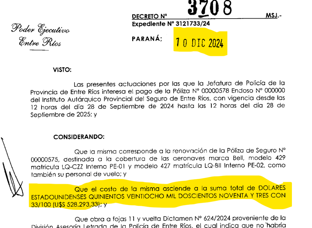 En un nuevo caso de opacidad y posible malversación de fondos públicos, el Gobierno de Entre Ríos autorizó mediante el Decreto 3708/2024 el pago de USD 528.293,33 por una póliza de seguros para aeronaves policiales, un monto que supera en un 47% lo abonado en 2019 (USD 360.230,89) y que, según estimaciones de expertos, podría costar hasta 5 veces menos en el mercado privado (USD 100.000).