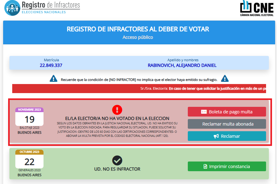 En ambos expedientes, la notificación oficial de la Justicia Electoral es clara: “El/la elector/a no ha votado en la elección. Para regularizar su situación, puede solicitar su justificación dentro de los sesenta días o abonar la multa prevista por el Código Electoral Nacional (artículo 125)”.
