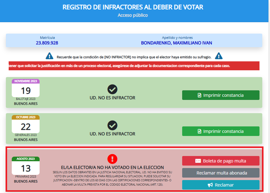 Por su parte, Maximiliano Iván Bondarenko, que encabezó la lista libertaria en la tercera sección, presenta un caso aún más grave: se ausentó en tres elecciones consecutivas —2019, 2021 y 2023— sin justificación alguna, lo que revela una conducta de desapego a los valores democráticos.