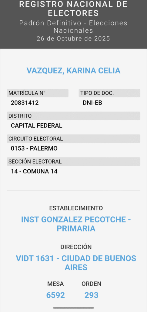La cabeza de lista de Javier Milei en la provincia de Buenos Aires no figura empadronada en ese distrito: según el padrón electoral definitivo, vota en la Ciudad Autónoma de Buenos Aires, en la mesa 6592 del instituto González Pecotche, en Palermo.