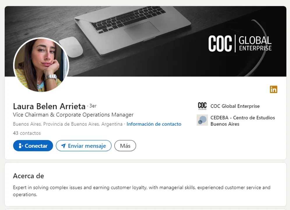 Según indica en su red social LinkedIn, Arrieta trabaja hace un año y tres meses como Gerente de Operaciones en COC Global Enterprise, un fondo de inversión que opera en los mercados de Estados Unidos y América Latina, donde se ocupa de “las operaciones corporativas y las de varias unidades de negocio”.