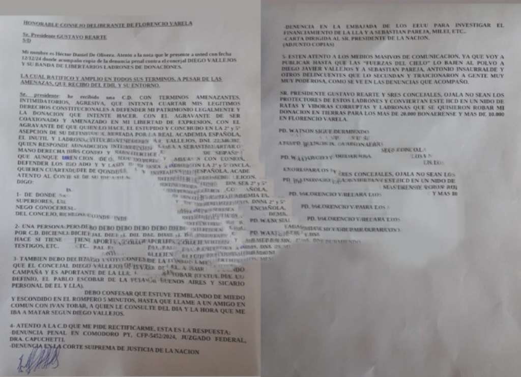 En respuesta a las amenazas que afirma haber recibido por parte de Vallejos, De Oliveira contestó formalmente una carta documento y presentó una notificación en la mesa de entradas del Concejo Deliberante de Florencio Varela. En esta presentación, exigió sanciones contra Vallejos y “toda su banda”, que según él responde a Sebastián Pareja.
