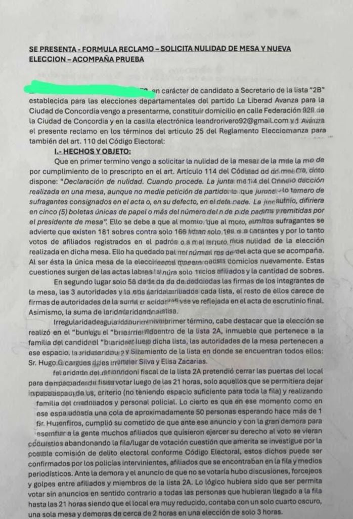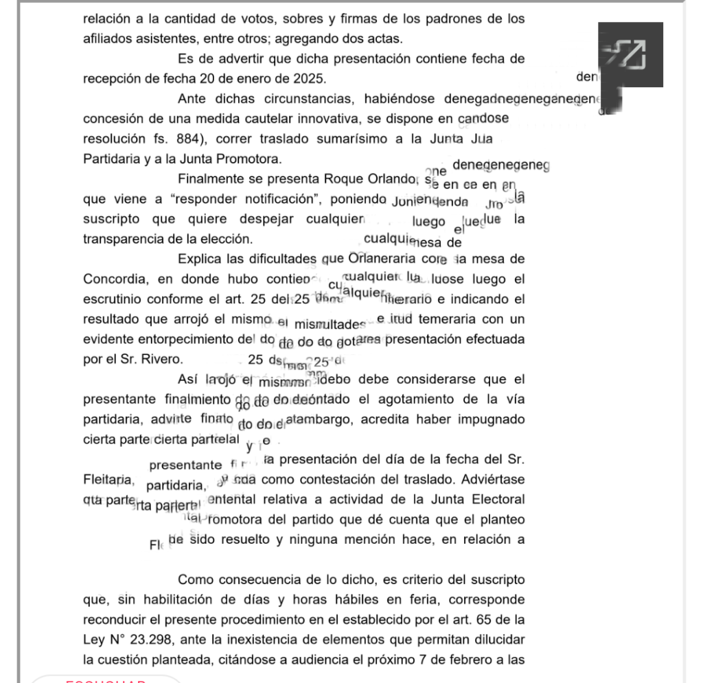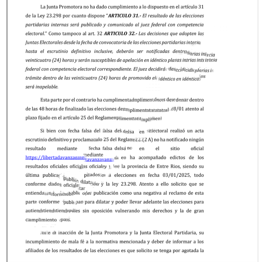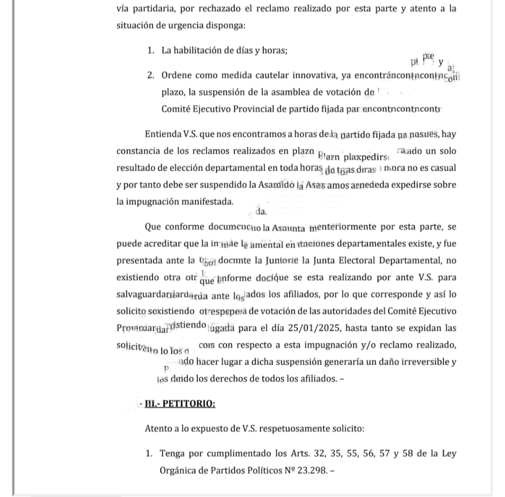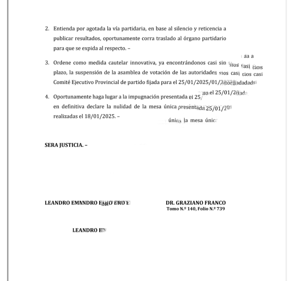 Este acusa a la Junta de violar los artículos 31 y 32 de la ley Orgánica de Partidos Políticos, que obligan a publicar y comunicar los resultados al juez electoral en un plazo estipulado. Además, argumenta que el acta de escrutinio y proclamación del 25 de enero es ilegítima al no haber sido publicada en el sitio oficial del partido ni en el Boletín Oficial de la provincia. En su presentación, también solicitó como medida cautelar la suspensión inmediata de la asamblea para evitar “un daño irreversible” y salvar los derechos de los afiliados